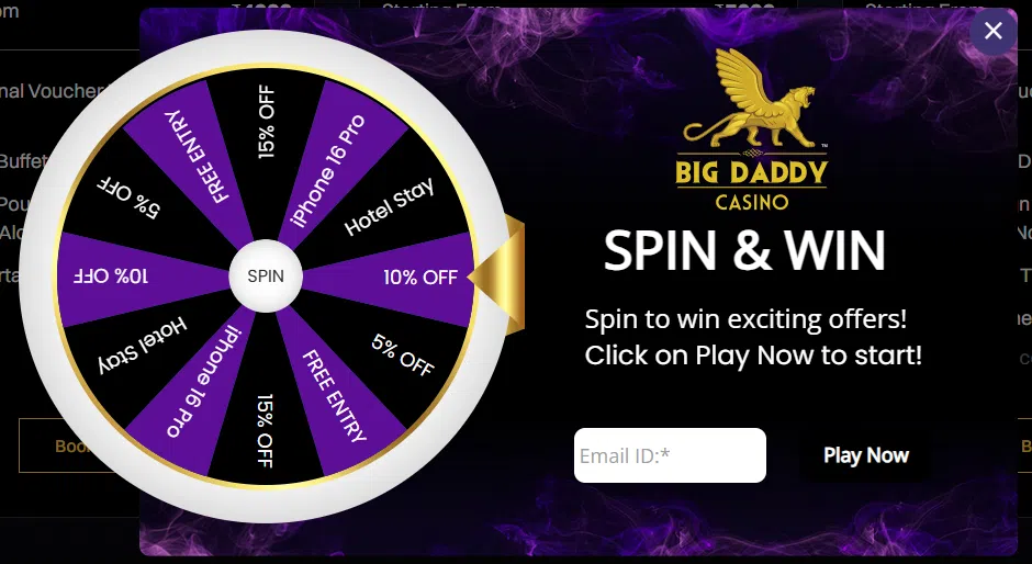 Simply enter your email ID, hit Play Now, and spin the wheel to reveal your Big Daddy Casino special offer. It’s the perfect way to start your gaming adventure.